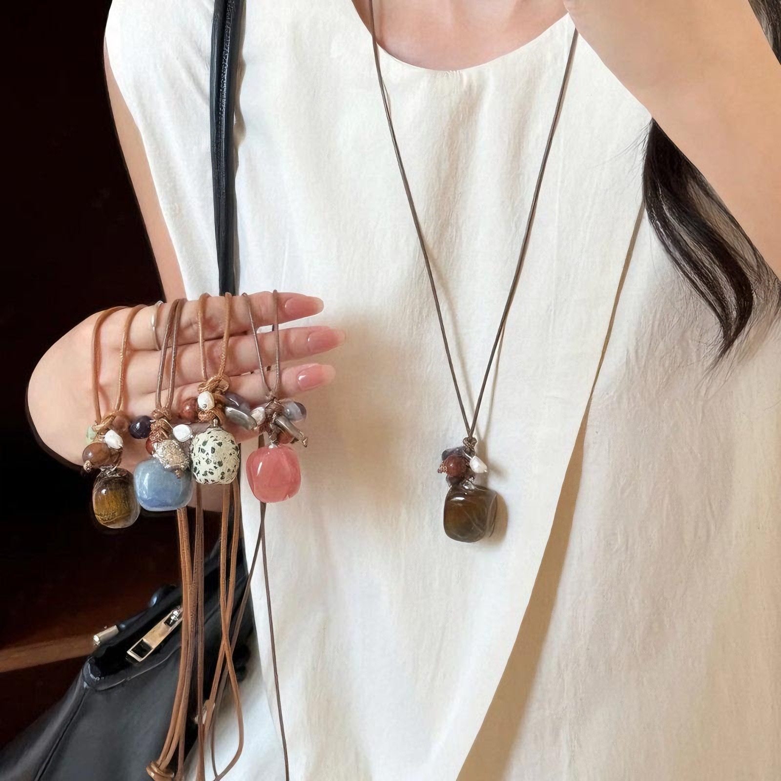 天然石パール編組ロープネックレス女性のレトロな新しい中国風タイガーアイストーン鎖骨チェーンロングホルタースポットアクセサリー