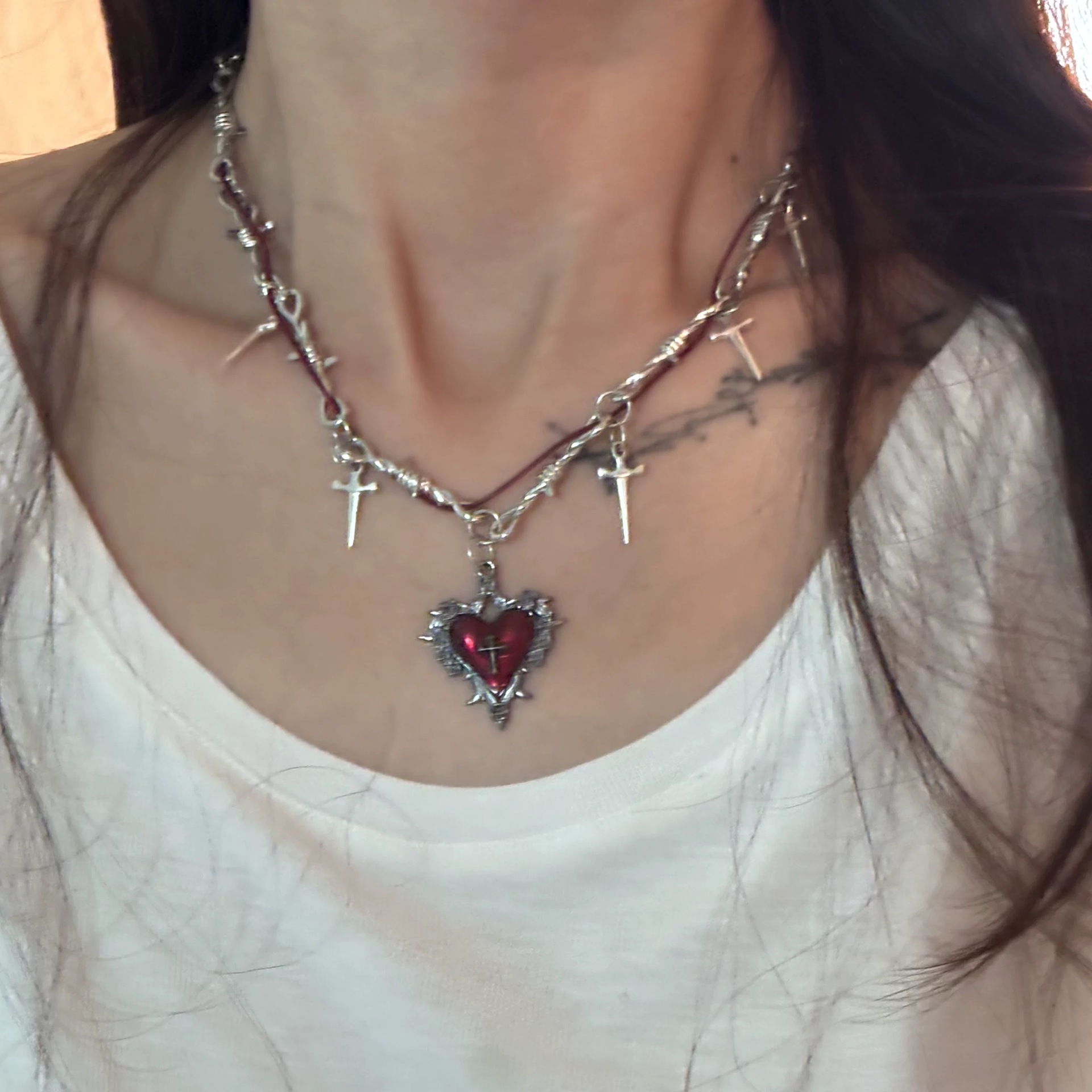 甘くてクールなとげ巻きネックレスレッドラブメタルパンク鎖骨チェーンホットガールy2kクロスアクセサリー