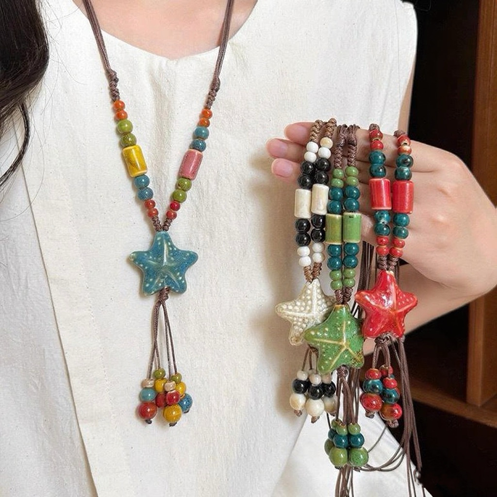 ボヘミアンセラミックカラフルなビーズヒトデネックレス女性のレトロエスニックスタイル編組ロープロングスウェットシャツチェーンアクセサリー