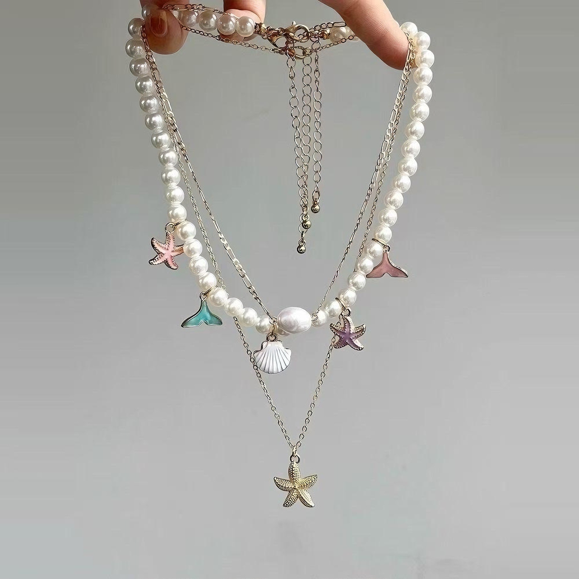 ボヘミアンスタイルの貝殻、ヒトデ、パールネックレス、女性用の軽い高級感とハイエンドの多層鎖骨チェーン、海辺の休暇アクセサリー