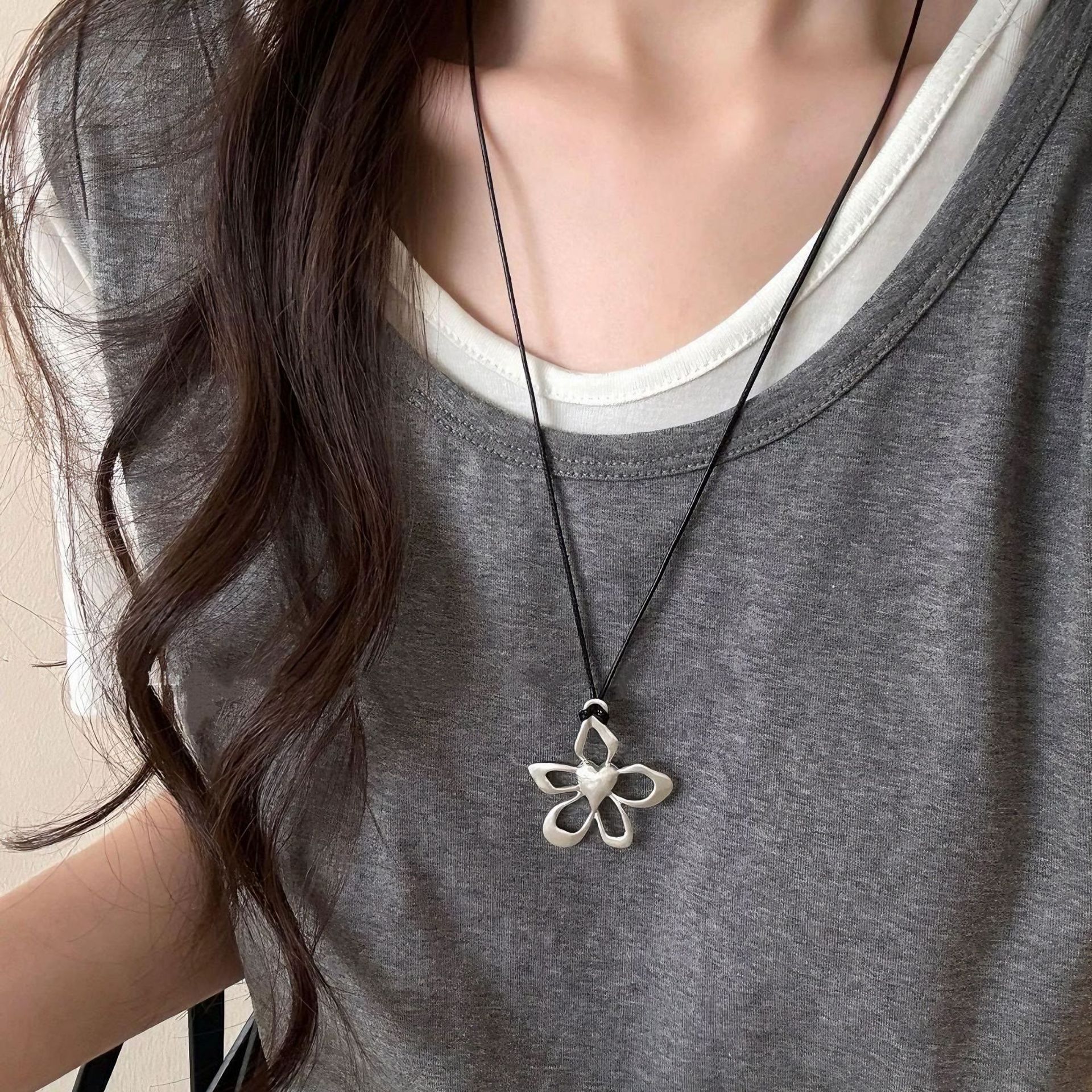 インブロガー シルバー 中空花 ブラック ロープ ネックレス レディース サマー ネックレス 学生 パーティー デイリー 多用途 ロング アクセサリー