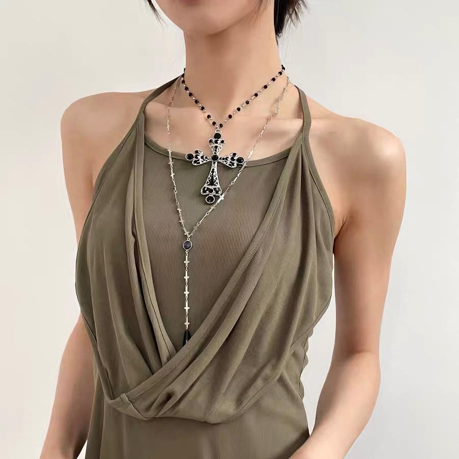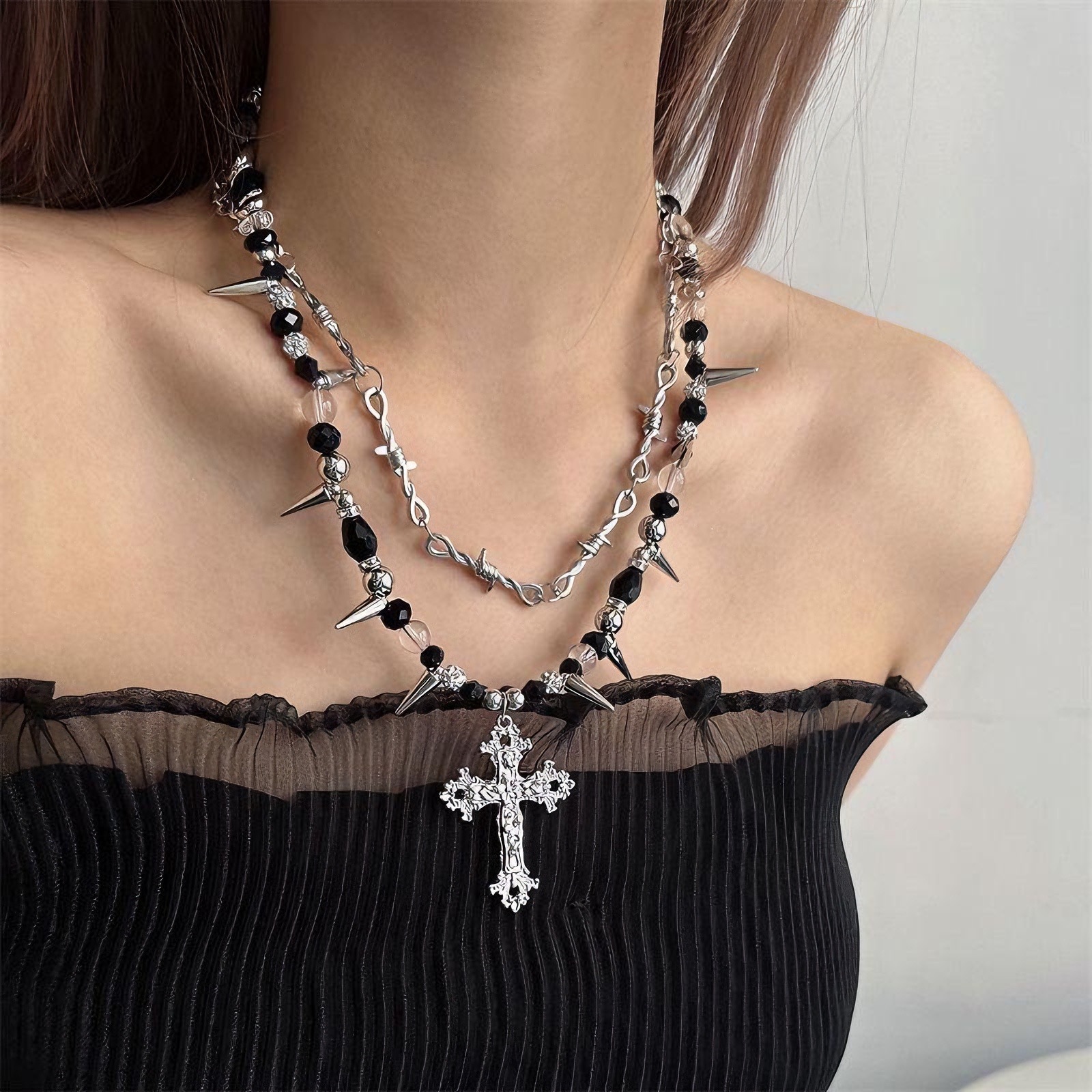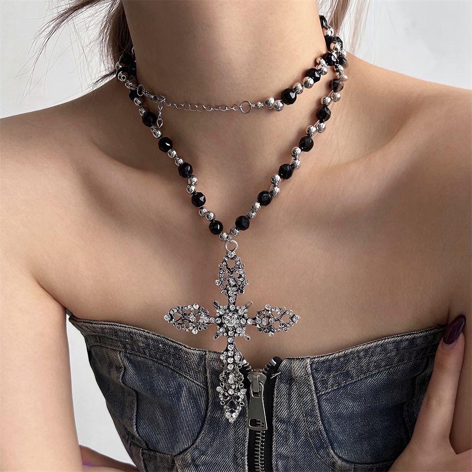 スイートクール y2k ホットガールクロスビーズネックレスダークゴシックパンクスタックロング鎖骨チェーンニッチネックレス