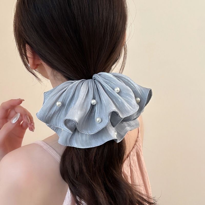 フレンチスタイルのスーパーフェアリーフローラルガーゼビーズヘアゴム、高級ふわふわプリーツヘッドフラワー、優しく万能なヘアロープヘアアクセサリー