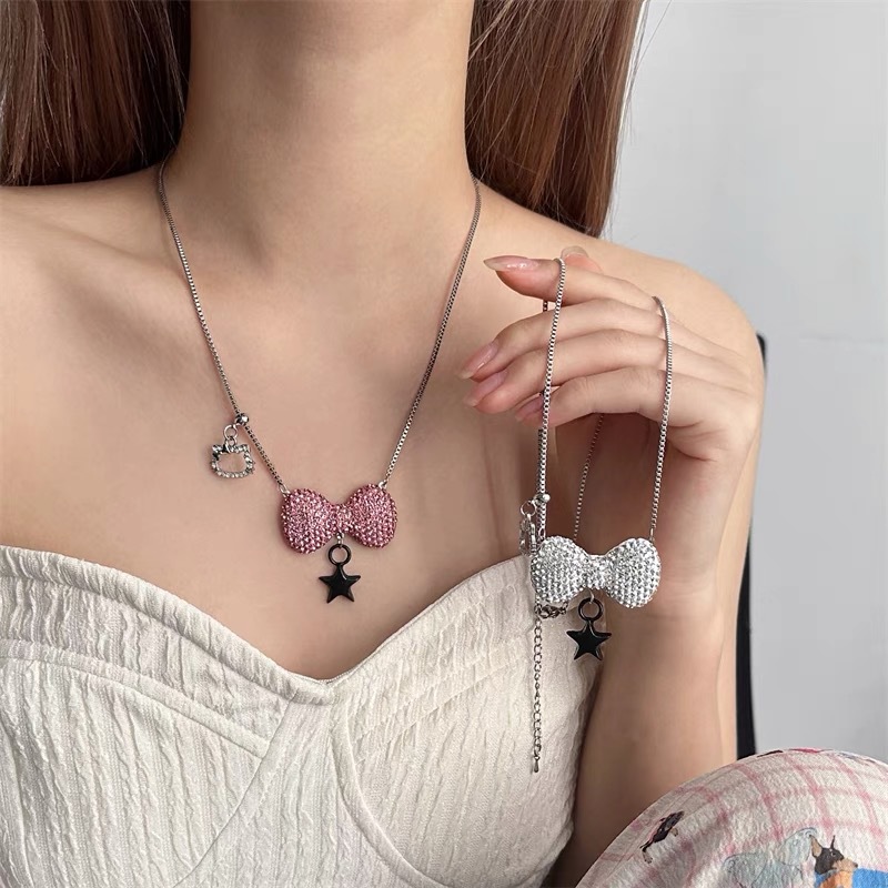 ガーリースイートクールスタイルピンクマイクロ象嵌リボンスターペンダントネックレスレディースニッチインスタイルパーソナライズ鎖骨チェーントレンド