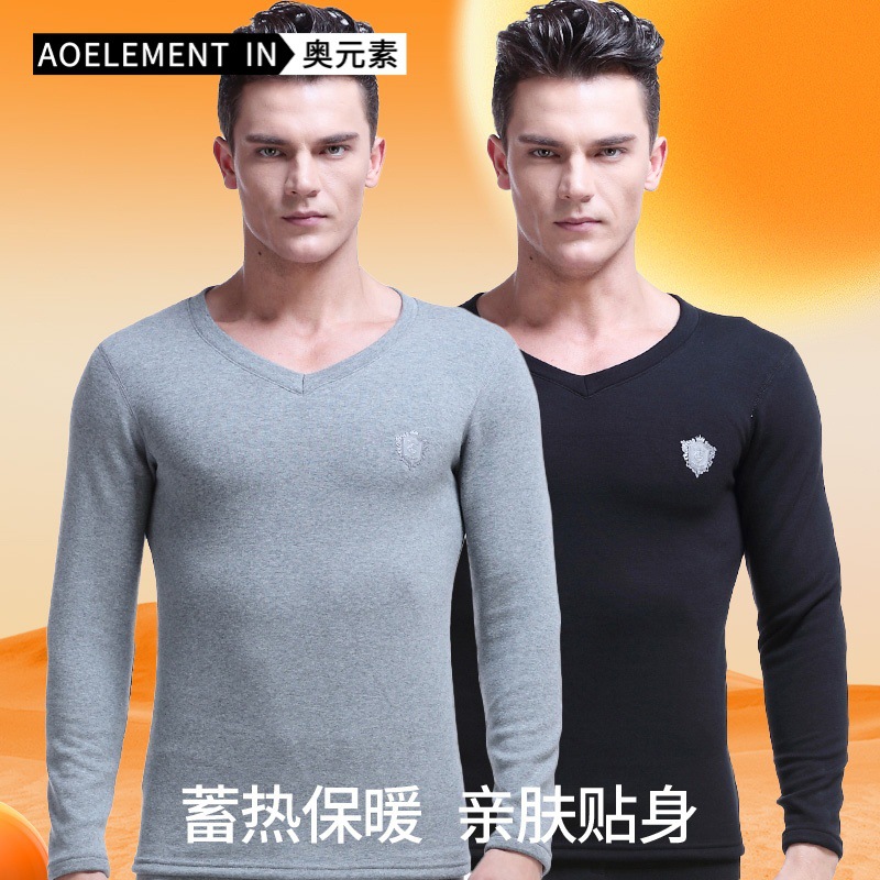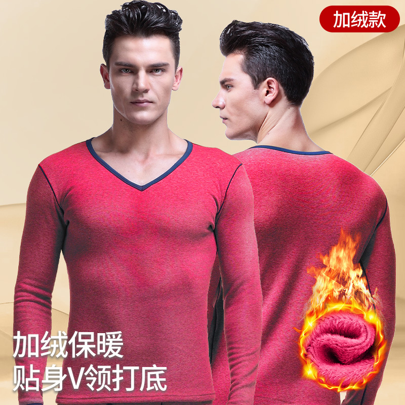 男性保温下着純色上着一枚に厚いベルベット秋衣底シャツ防寒低襟v襟綿セーター