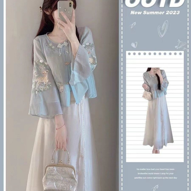 新しい中国風の古代中国の漢服女性の茶芸服ハイエンド唐装夏のトップシャツドレス 2 点セット