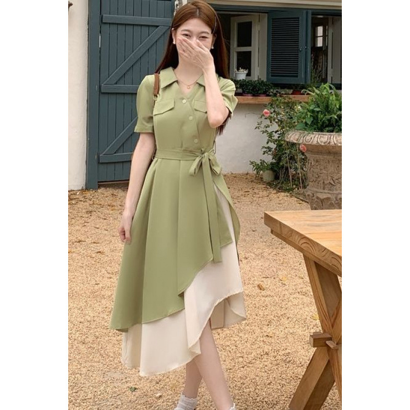 パフスリーブフェイクツーピースドレス、ゆったりお腹カバー、小柄な人向けの年齢軽減、太ったmm向けの夏の痩身リボンスカート