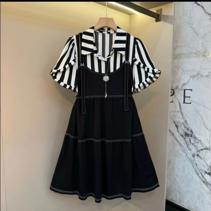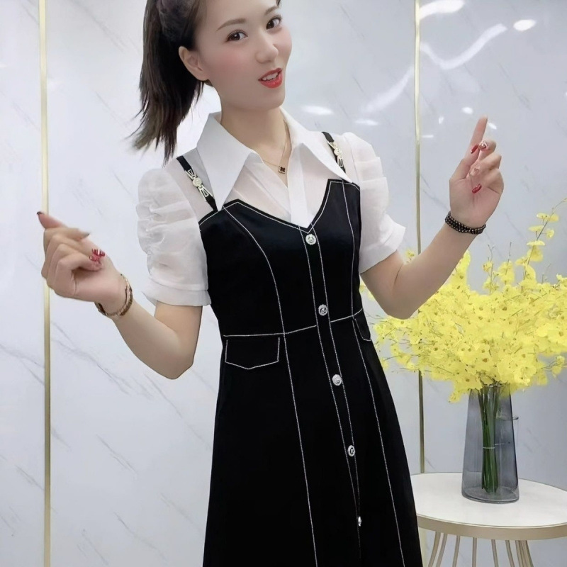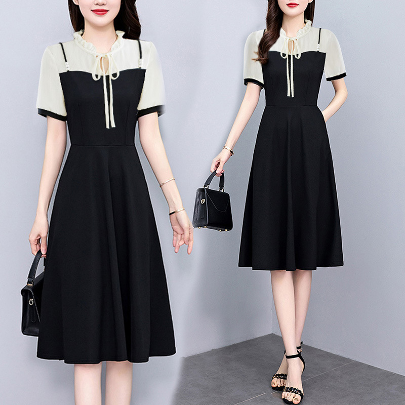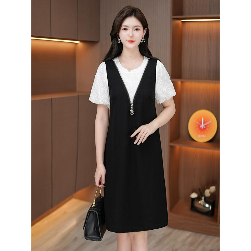 ファッショナブルでスリムな半袖ドレス夏 2025 新しいリトルブラックドレス偽ツーピース大きいサイズの小さなスカート