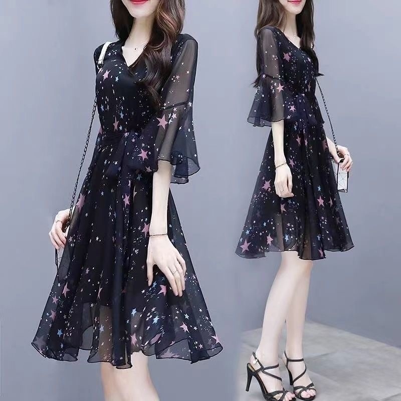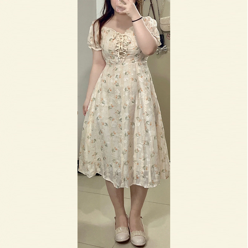 花柄シフォンドレス夏の女性の 2025 新しいウエストプラスサイズ痩身スカート