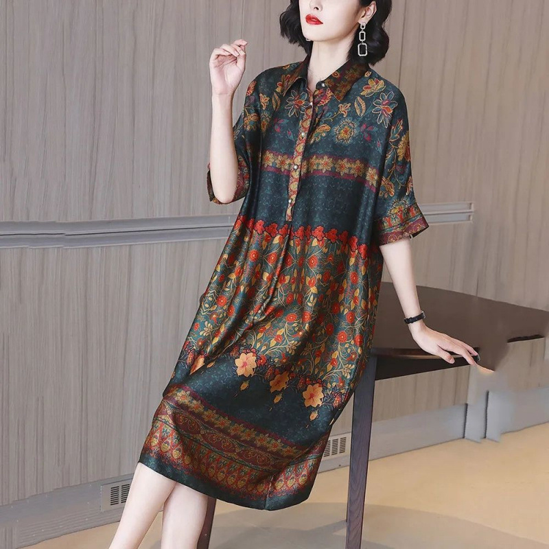 杭州シルクレトロプリントドレス 2025 春夏の新ファッション気質ルーズ痩身膝上ロングスカート女性のための