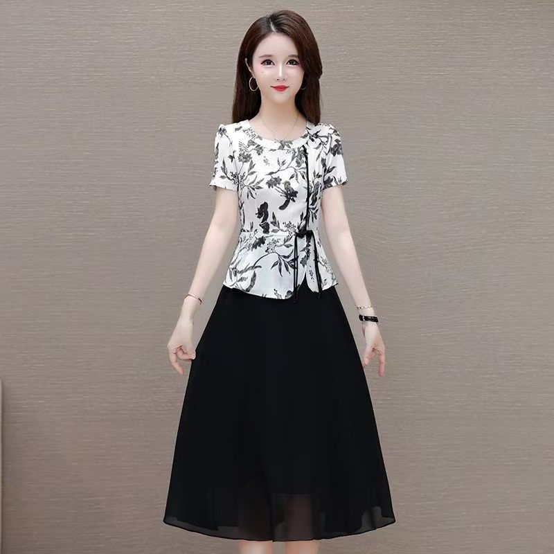 新しい中国風の偽ツーピースドレス夏の新しいウエスト痩身マザーズウェア大きな裾スカート半袖プリント