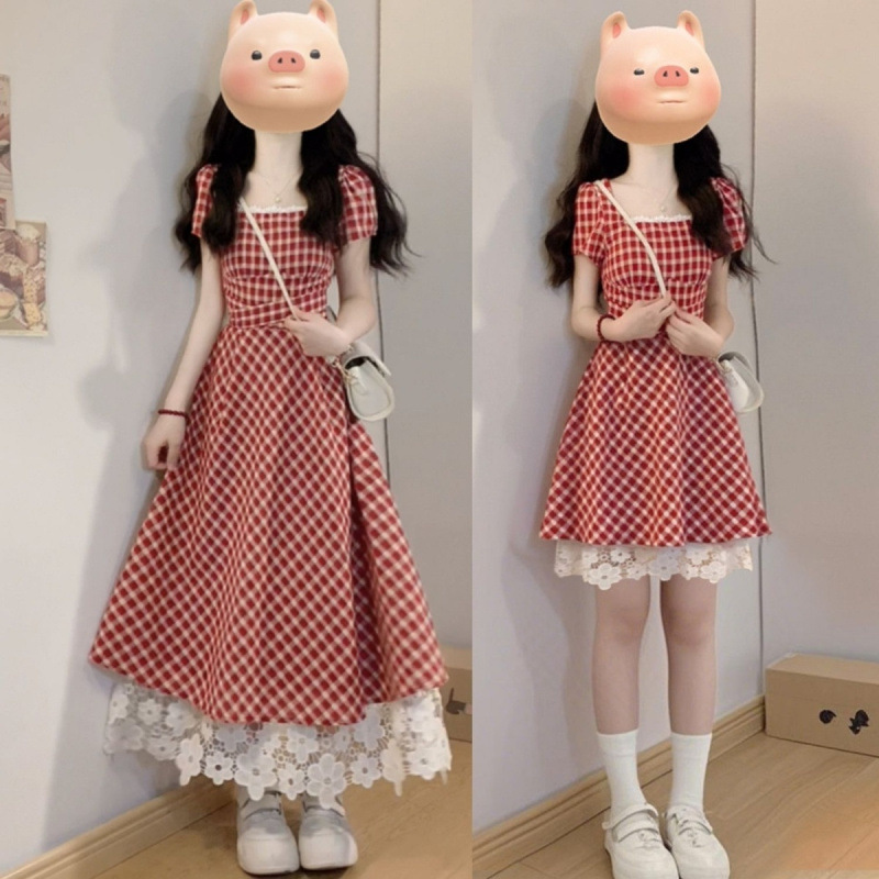 プラスサイズのファットチェック柄フレンチ新しいレッドレトロサマードレスレディースレーススカートスリムロングスカート