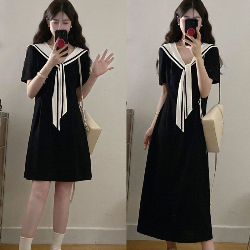 2025 新しい夏のニッチファッション年齢軽減プラスサイズヨーロッパスタイルネイビーカラーのリトルブラックドレススリム半袖ドレス