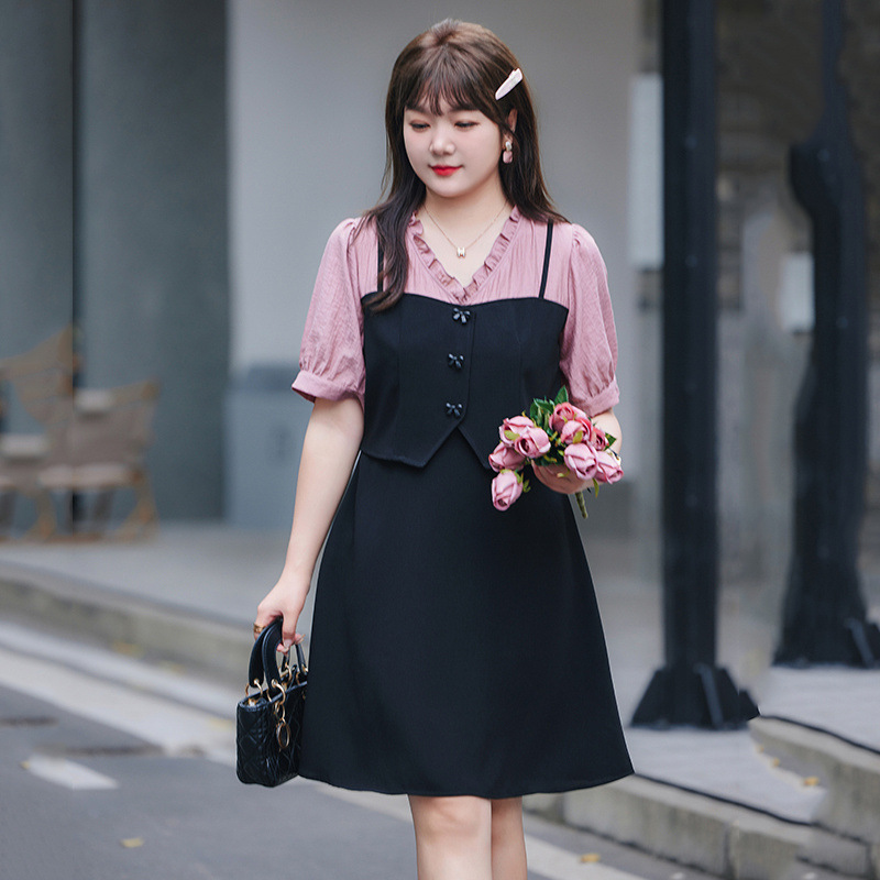 プラスサイズの女性の偽ツーピース V ネックステッチカジュアルドレス夏の新しい半袖ファットミリリットルカバーお腹リトルブラックドレス