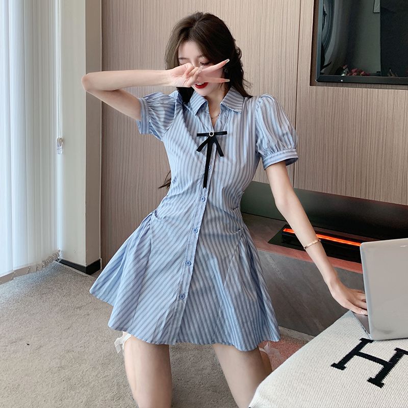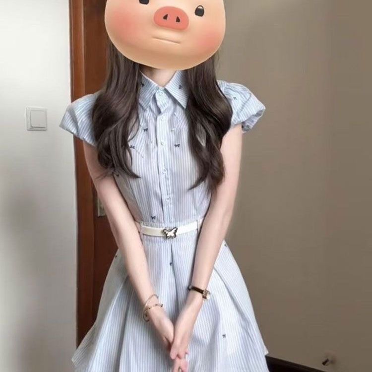 ブルーストライプシャツドレスレディース夏2025新しい小柄な韓国スタイルウエストAラインスカート