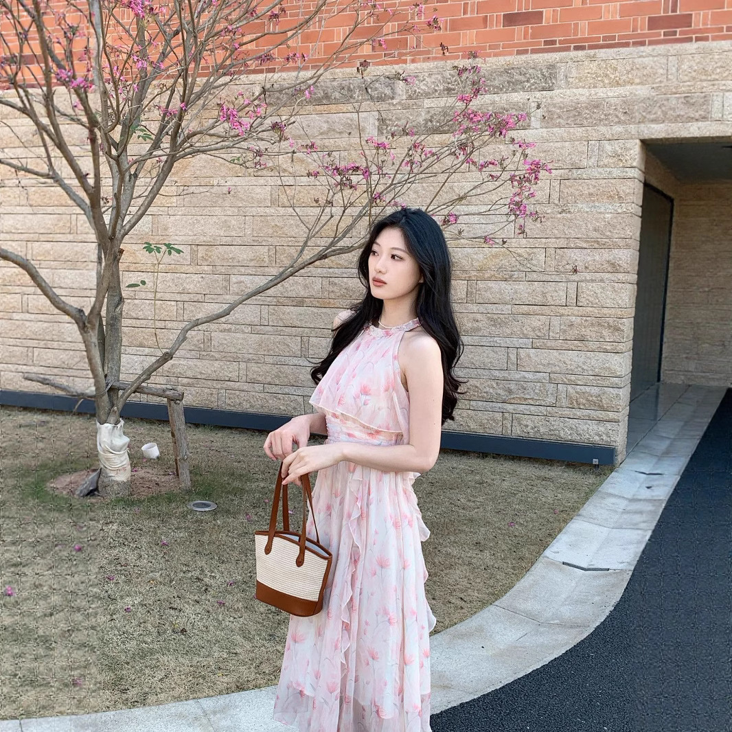 フランス式のロマンチックな仙気は長いスカートの子供を染めて首の不規則な休暇の風のピンクのワンピースを掛けます2025夏