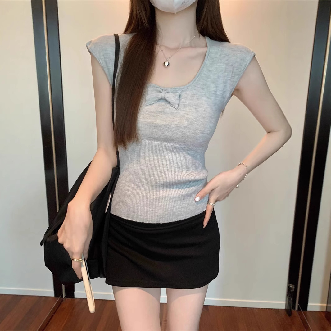 Sweet Hot Girl Bow Pure Desire スリム半袖 Tシャツ女性用 2025 夏韓国スタイルセクシーな胸見せソリッドカラーニットトップ