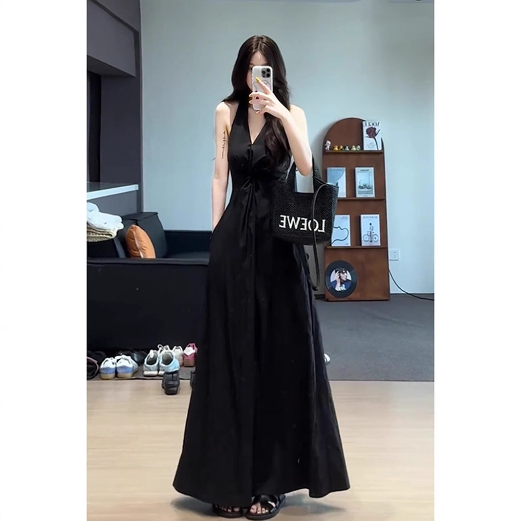 フレンチヘップバーンスタイルノースリーブVネックツイストウエストベストドレス女性用2025新しい気質スリムロングスカート夏