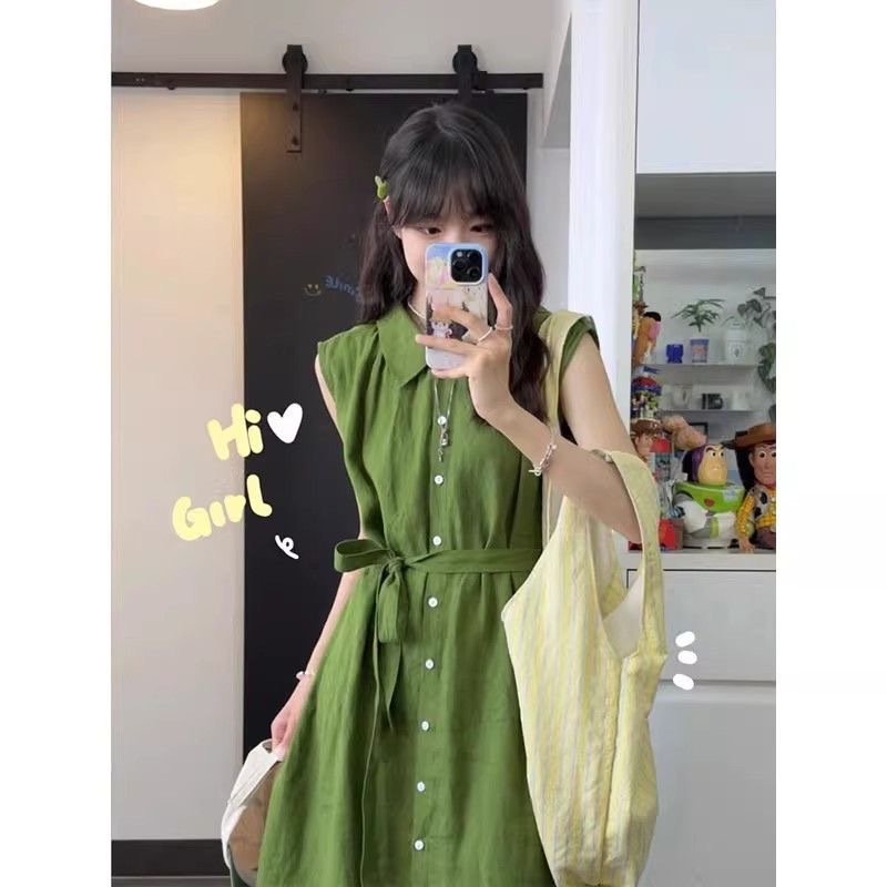 レトロヴィンテージグリーンシャツノースリーブワンピースレディースシンプルカジュアル夏ゆったりリラックス雰囲気ロングスカート