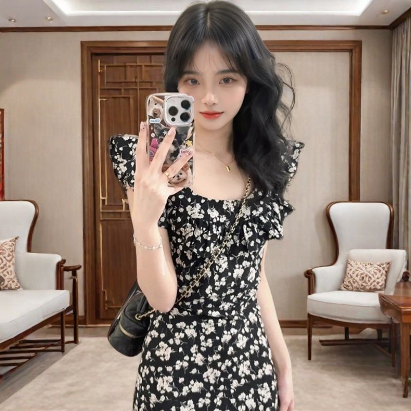 2025新型フランス式のヘボン黒い女性の花のワンピースの夏の小さい飛袖の気質は腰のスカートのロングスカートを収めます。