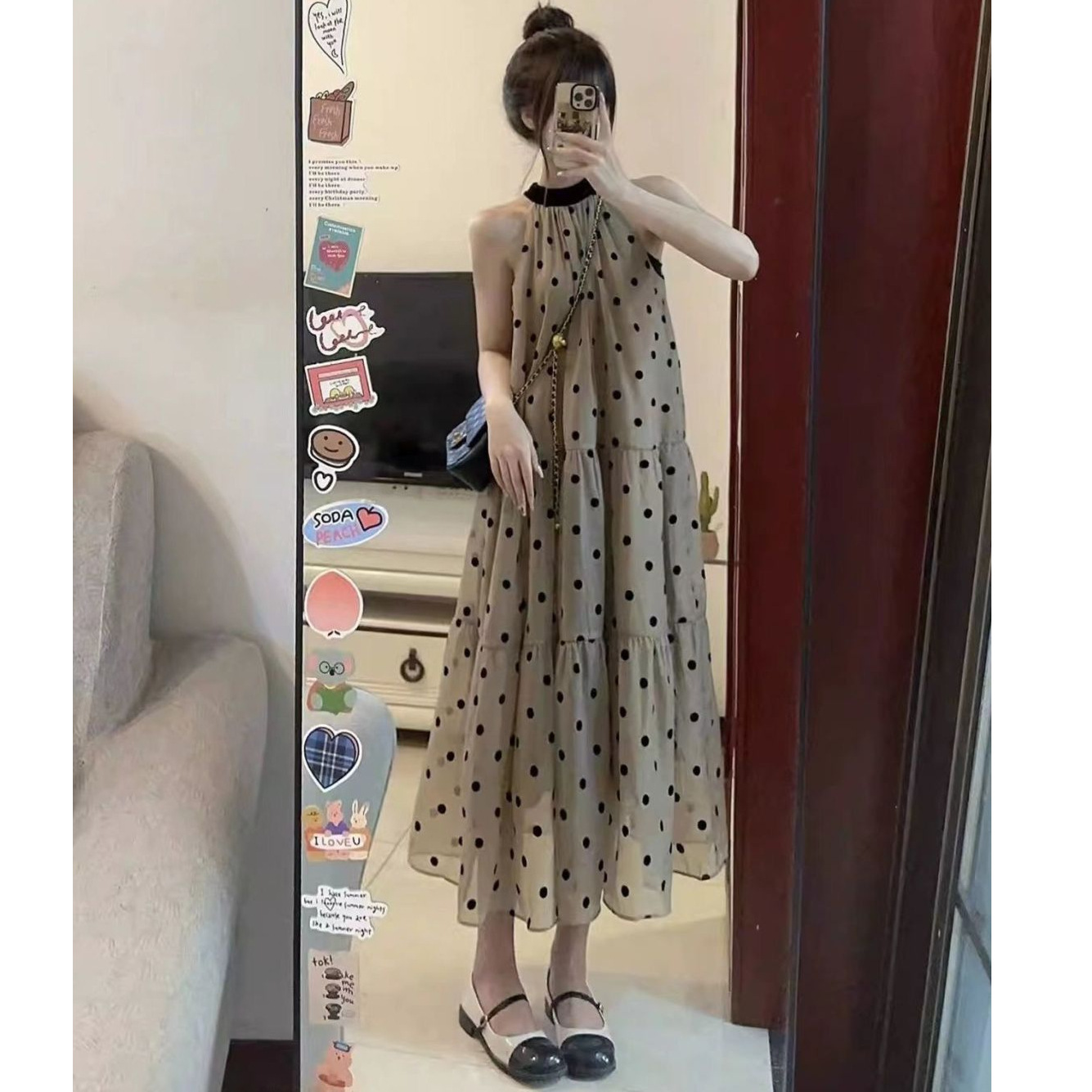 U ネックリゾートスタイルイエローサスペンダードレス女性の夏の新しい三亜海辺バックレスビーチドレスルーズロングスカート