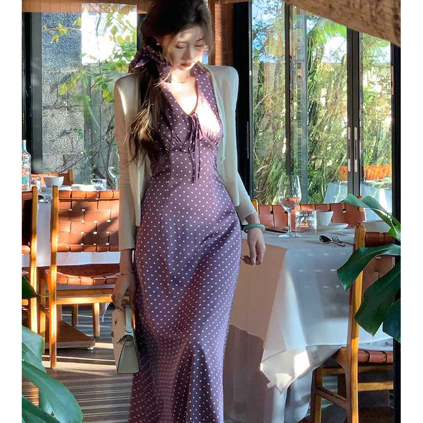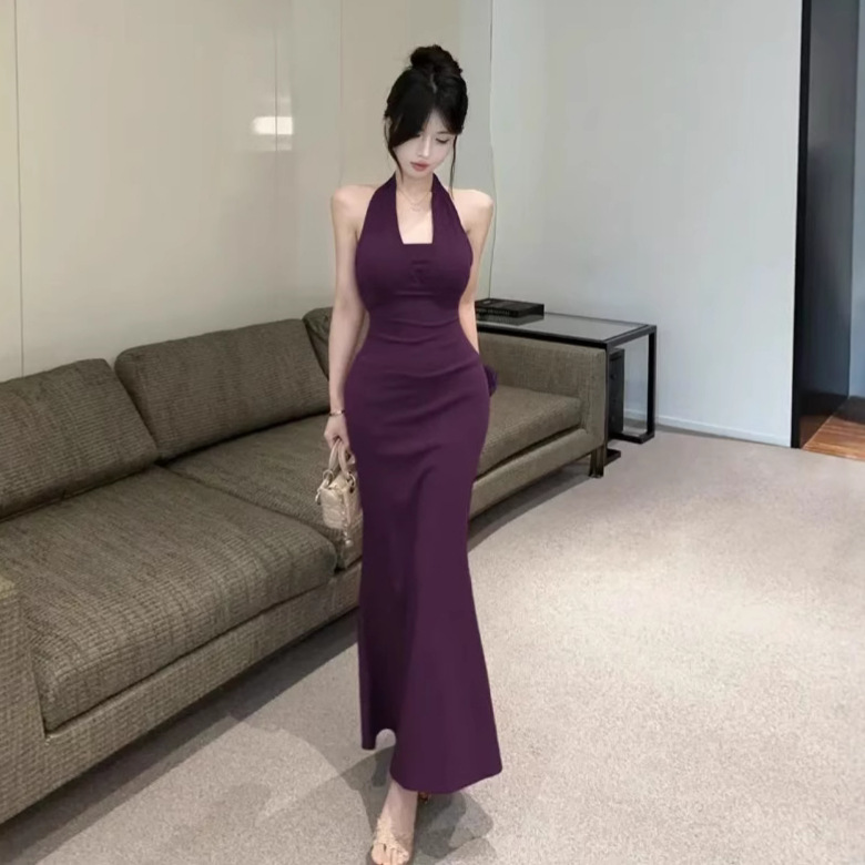 紫の波のポイントの露背の首のワンピースの女性の夏の高級感の修身のスカートのギャルの風は腰を収めてお尻のロングスカートを包みます。