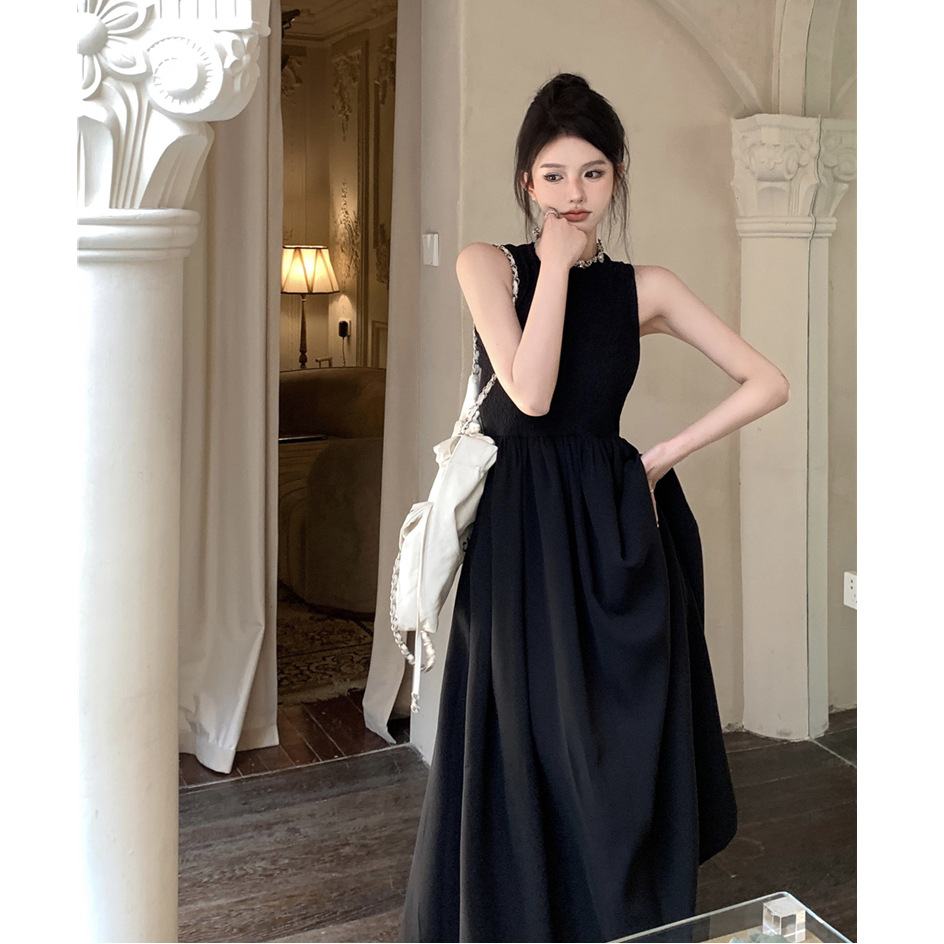2025新型フレンチレトロ感chiウエストロングスカート気質ノースリーブデザイン感バックの透かし彫りワンピース女性