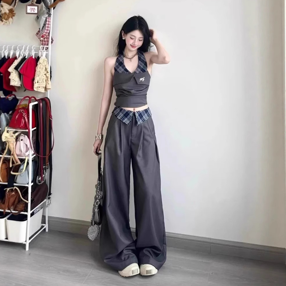 女性用スーツ 2025 夏の新しいスタイルの純粋な欲望のホットガールデザインステッチホルターネックノースリーブトップハイウエストワイドレッグパンツ