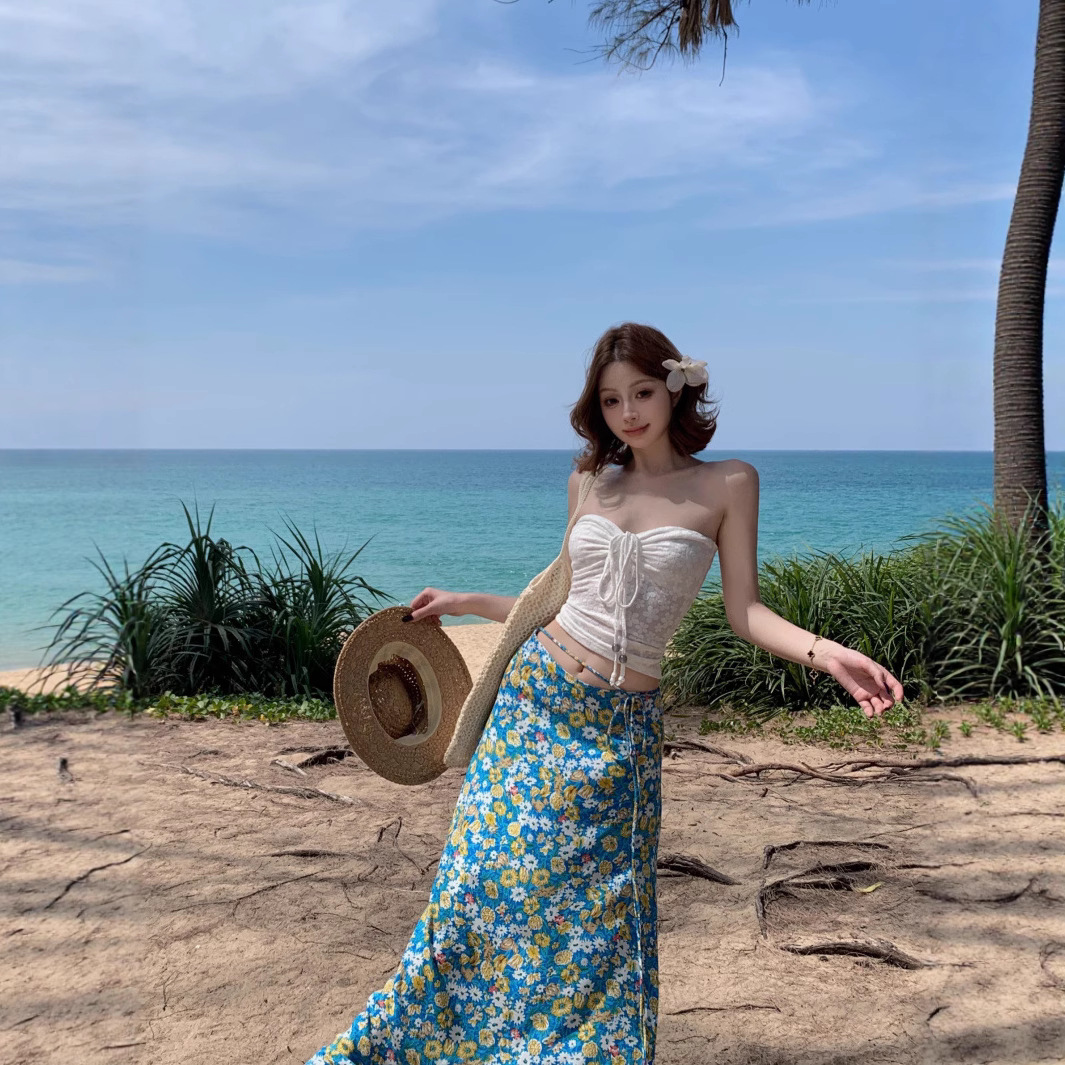 白いジャカードのストラップの美しい背中の胸のベストの女性2025夏の修身の中でリゾート風のギャルの長いスカートのスーツを掛けます。