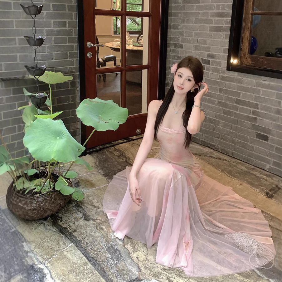 レーススプライシングサスペンダードレスレディースサマーフィッシュテールスカートピュアデューティウエストメッシュスカートボディシェイピングヒップカバーロングスカート