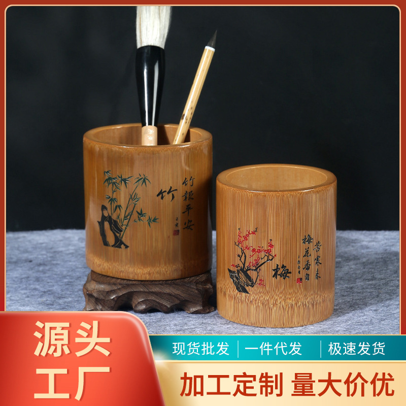 竹製筆筒文房四宝事務デスクトップ創意置物梅蘭菊彫刻竹製毛筆収納筒