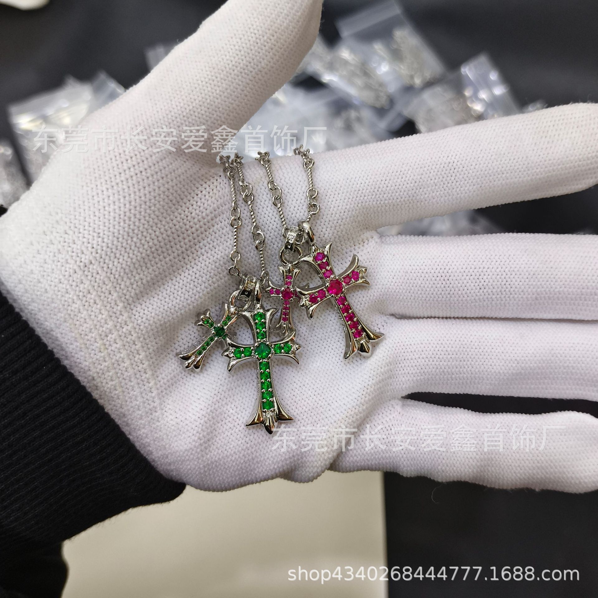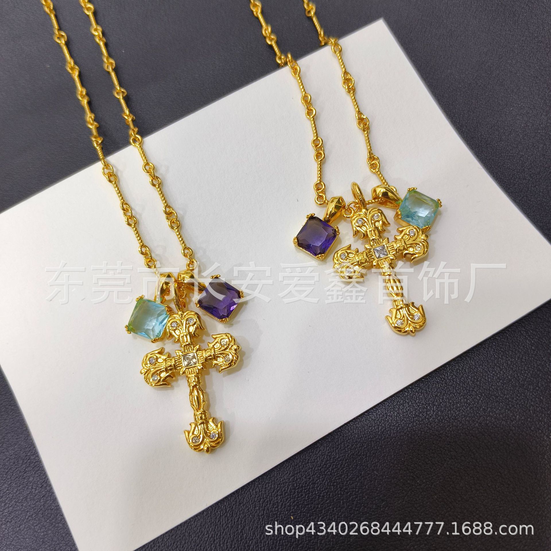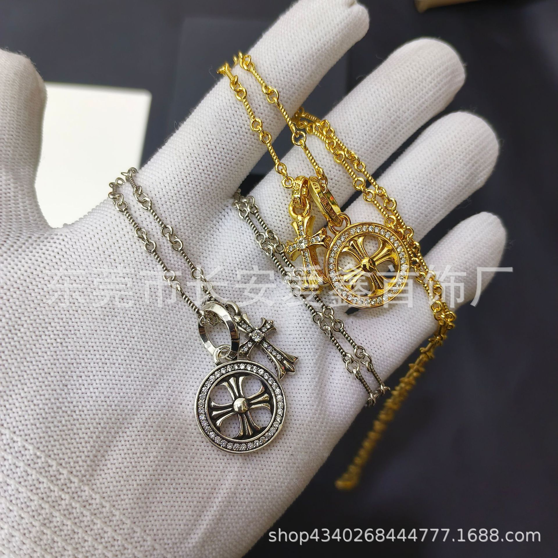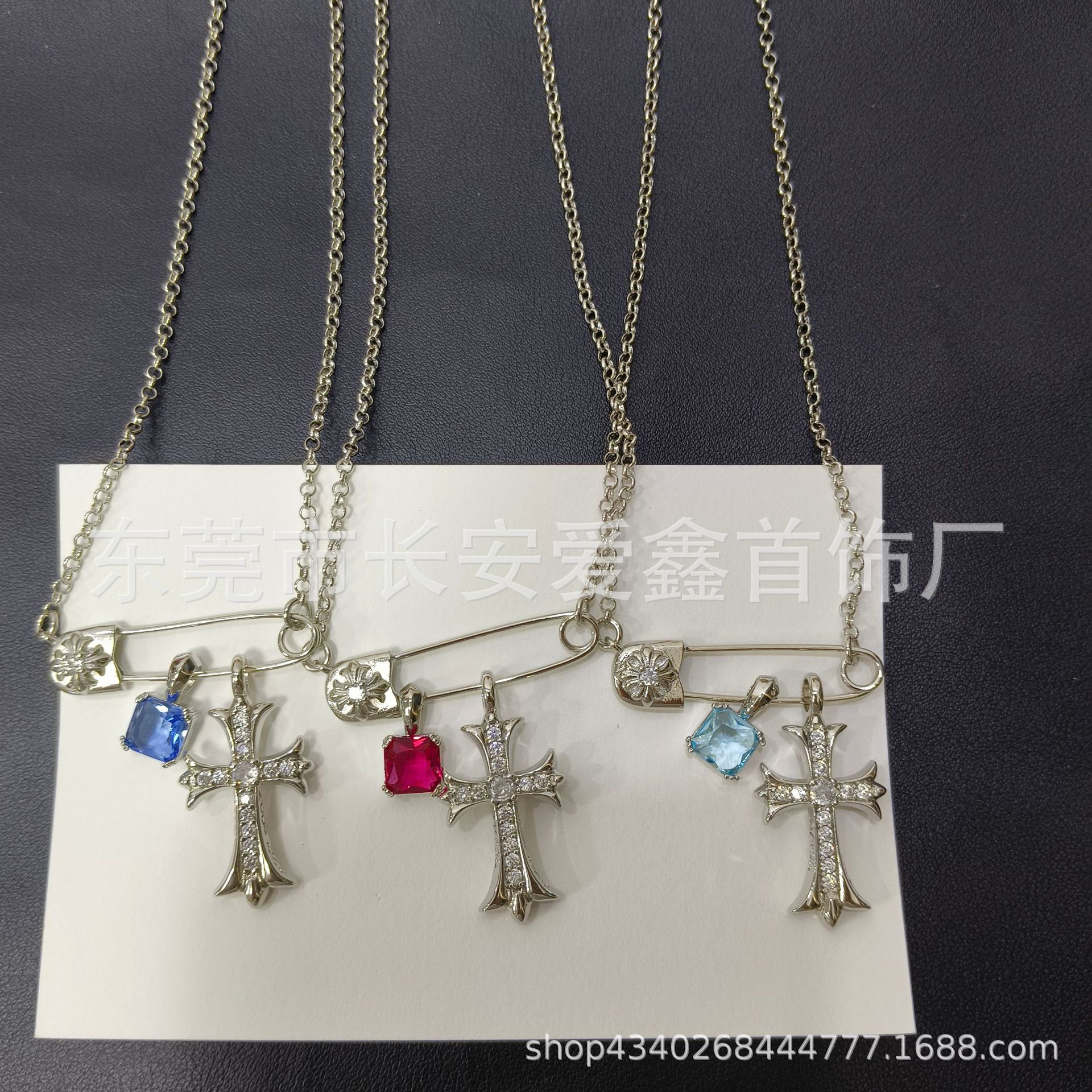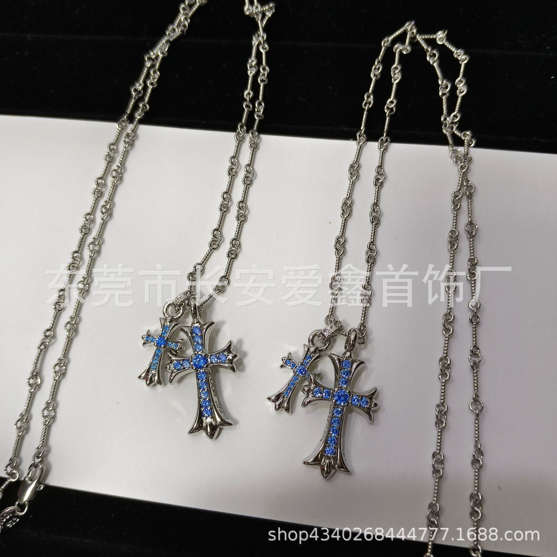 クロクロの新作のプラチナの淡い青のダイヤモンドの双十字のネックレスのパンクのヒップホップの潮流の個性の男女の同項のアクセサリー