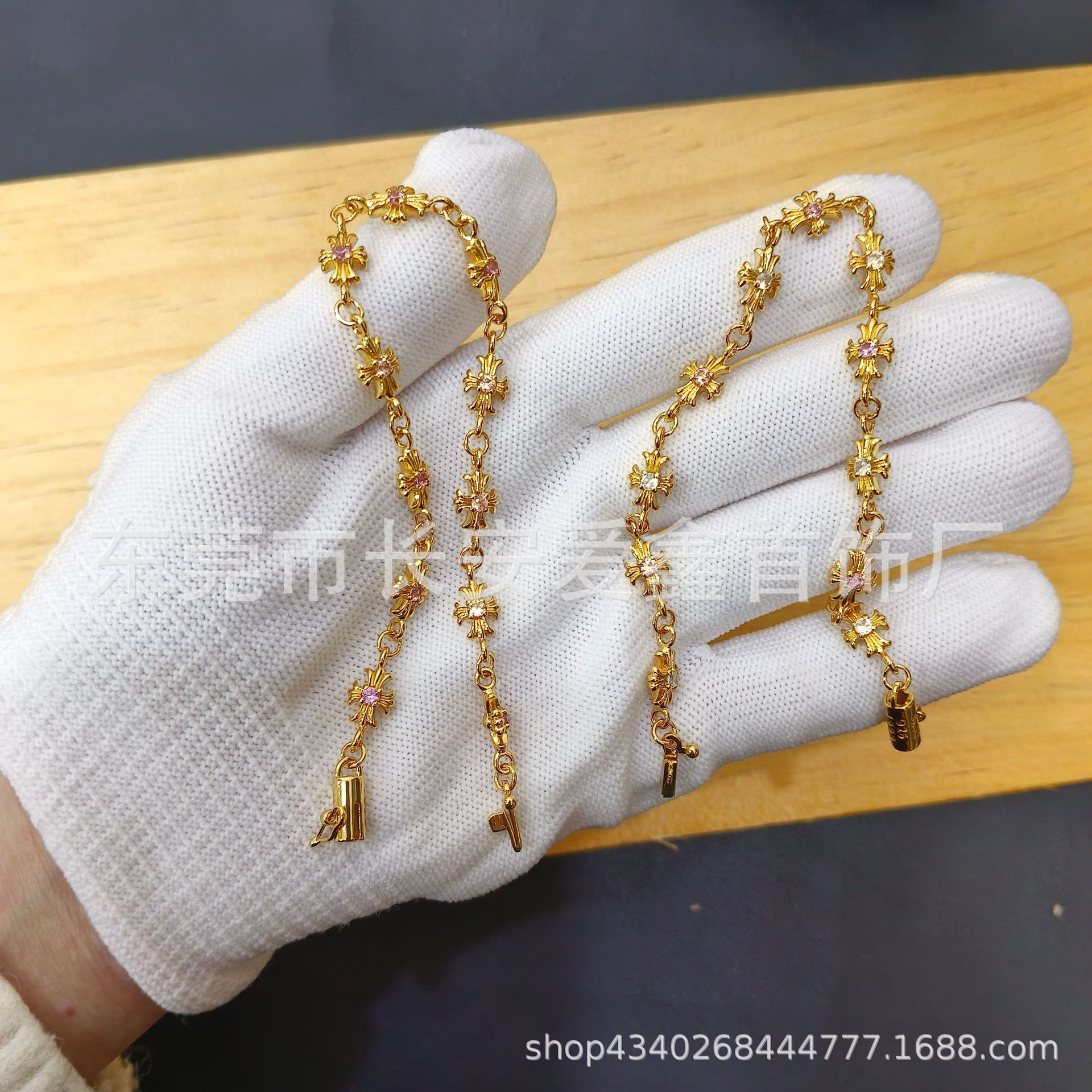 クロコダイルの金色に白いピンクのドリルの十字の花を混ぜてダイヤモンドの細いブレスレットを入れます。