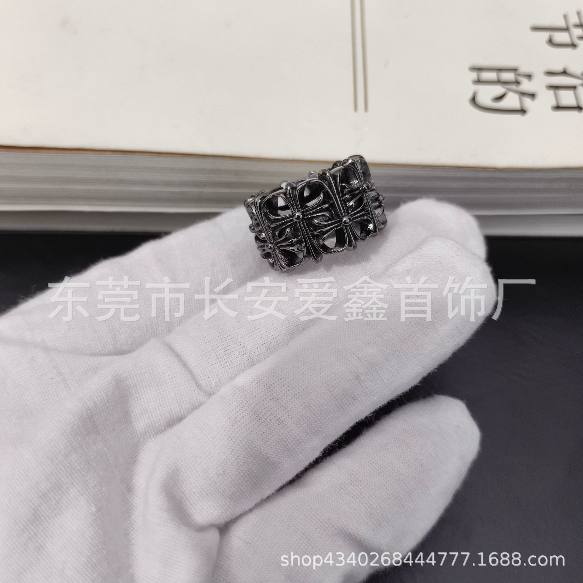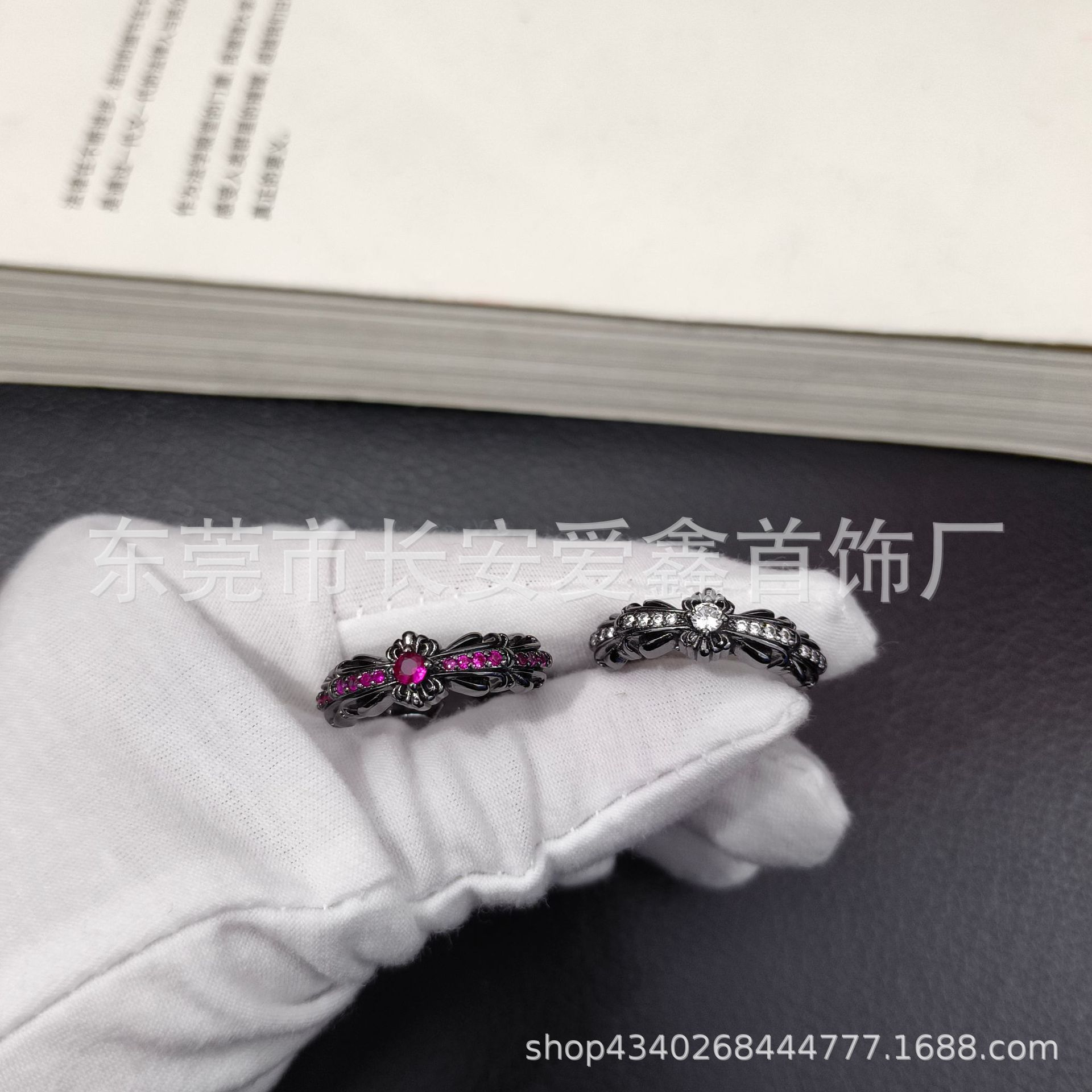 クロクロのレトロな黒い白いピンクのドリルの狭い版の十字の花の開口の指輪の女性の潮の男性の個性のファッションの簡単なリングの装飾