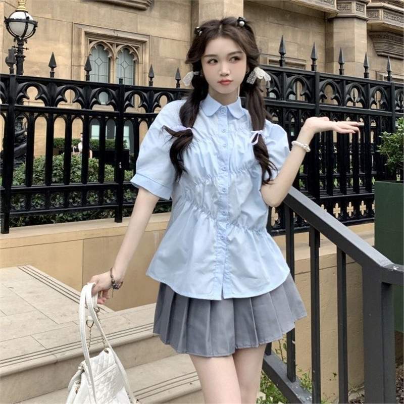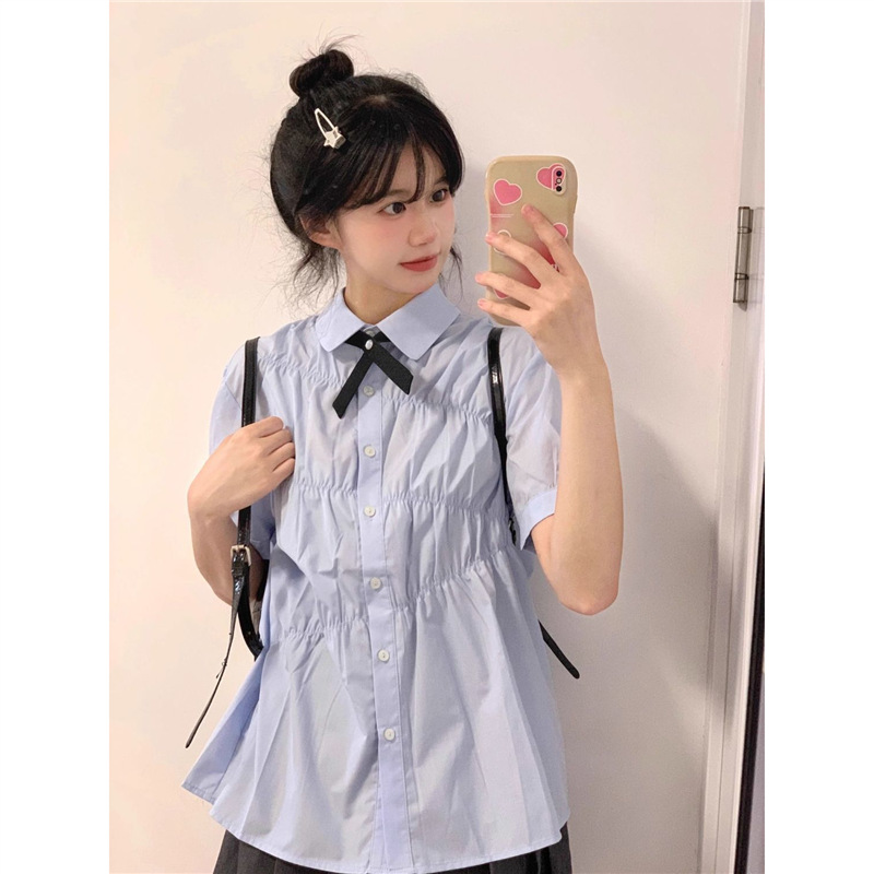 ブルー半袖シャツレディース夏学院風甘くてゆったりした純色シャツ韓国系高級感シワjkトップス