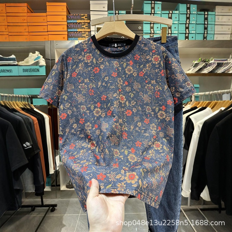 メンズレトロTシャツパーソナライズプリント半袖トレンディスリムラウンドネック花柄Tシャツ薄手カジュアル半袖