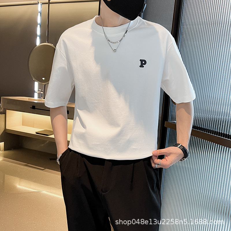 刺繍カジュアル半袖メンズシンプルレターPTシャツメンズ万能ルーズラウンドネックオフショルダー半袖シャツトップスT