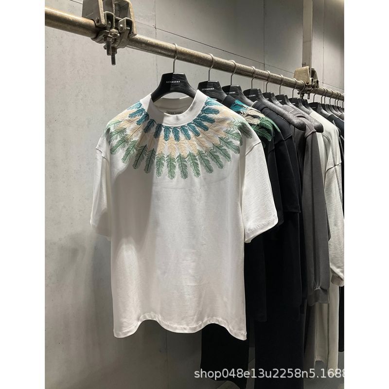 トレンディでファッショナブルな刺繍入りインハーフスリーブTシャツ、パーソナライズされたライトラグジュアリーラウンドネックプルオーバー半袖メンズカジュアルで快適なTシャツ