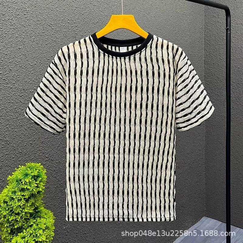 2025 新しいトレンディな質感中空ストライプ半袖 Tシャツメンズ夏怠惰な薄い Tシャツ半袖トップ