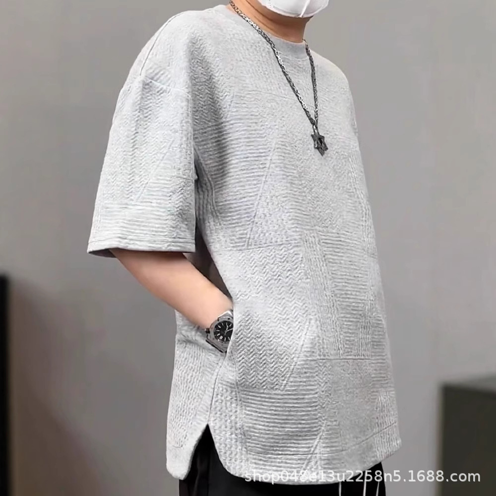 ヘビーエンボス加工テクスチャープリント半袖メンズ隠しポケットラウンドネックTシャツルーズカジュアル多用途半袖メンズTシャツ