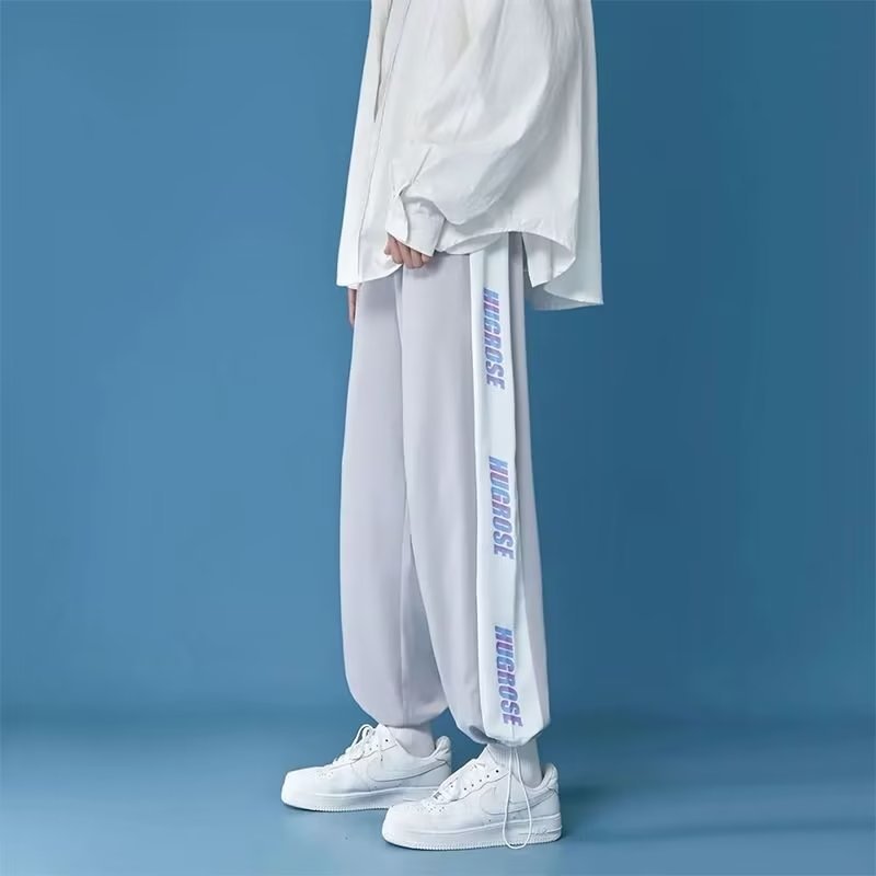 ストレートレッグパンツメンズ春夏新作薄いボーイズファッションドレープ巾着レターパンツスポーツパンツ