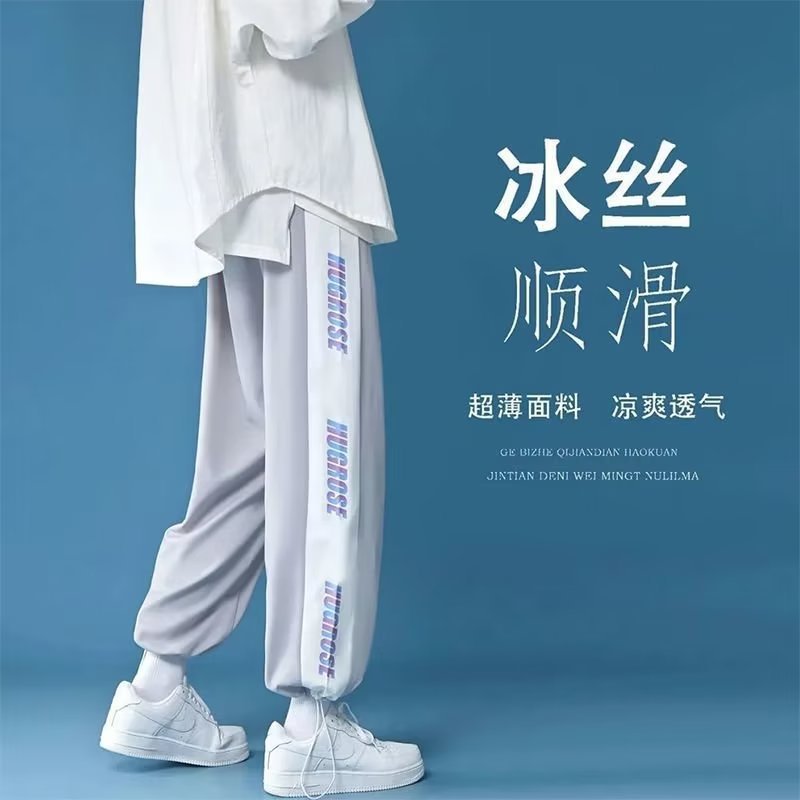 春夏のアイスシルクパンツメンズ薄手ルーズストレートドレープスポーツパンツ夏の男の子の速乾性カジュアルパンツ