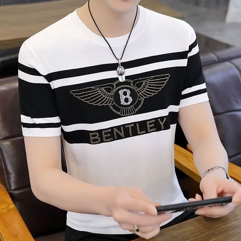 アイスシルク半袖Tシャツメンズ夏ラウンドネックカジュアル万能ボトムシャツハンサムストライプTシャツメンズトップスコントラストカラー