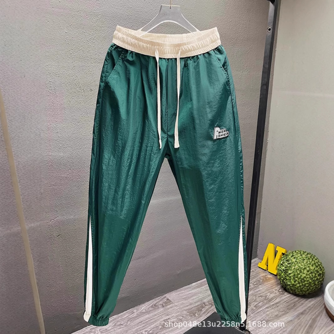 夏の薄いトレンディなブランドの多用途レギンスパンツメンズユースファッションルーズスポーツストライプスプライシング9点グリーンパンツ