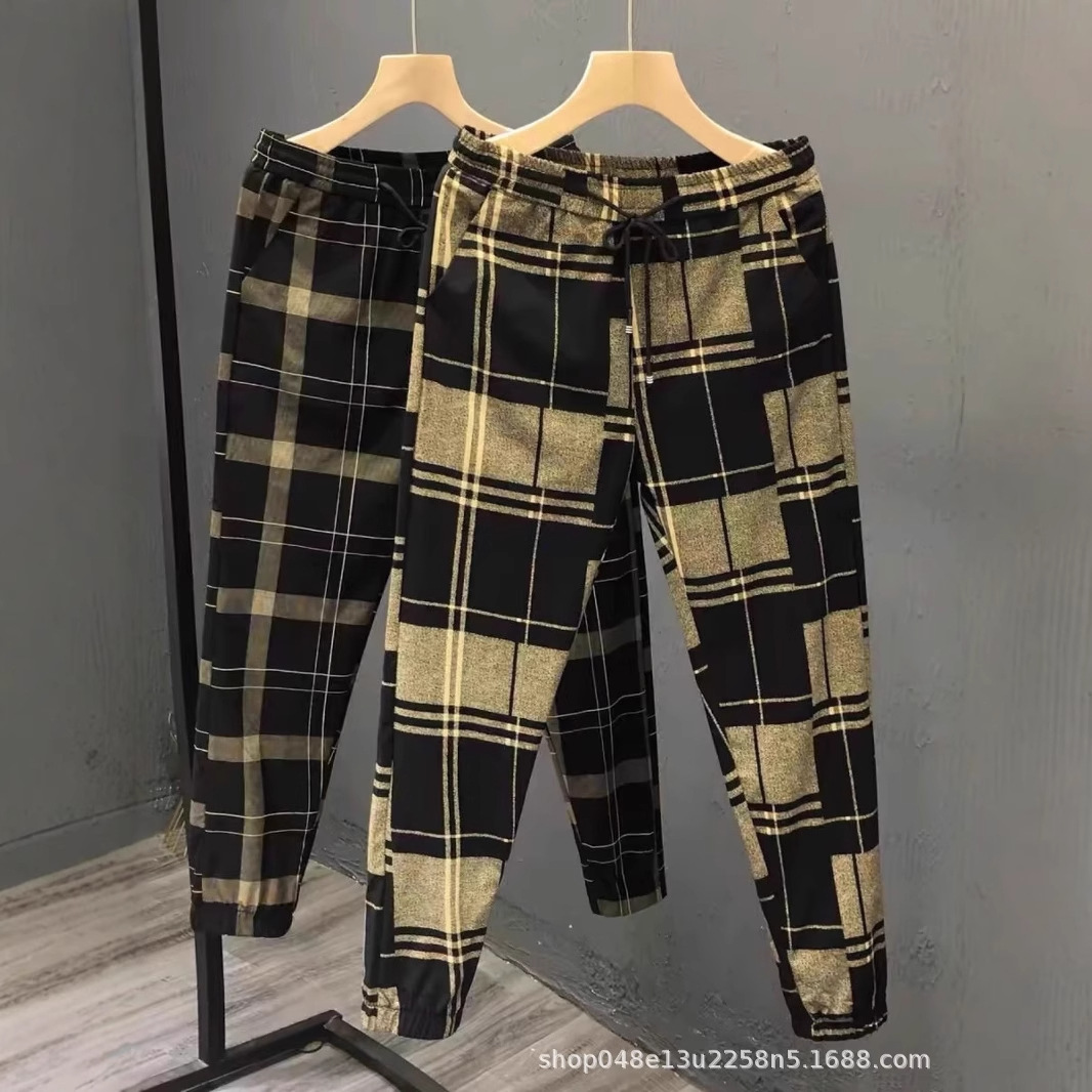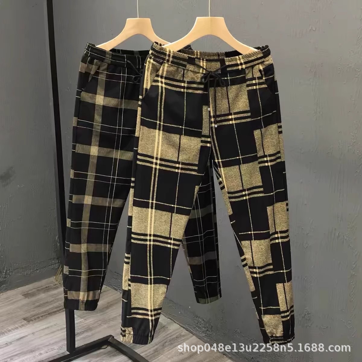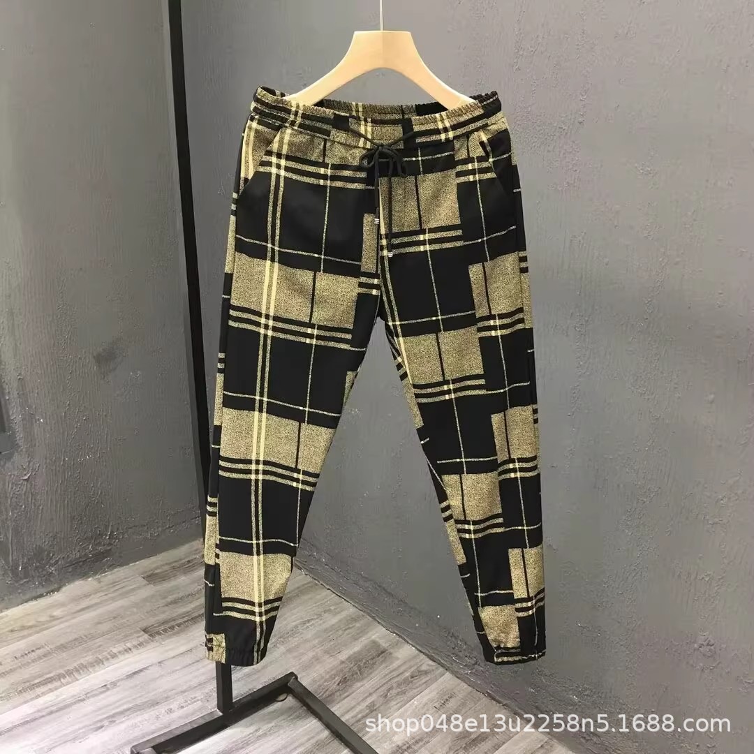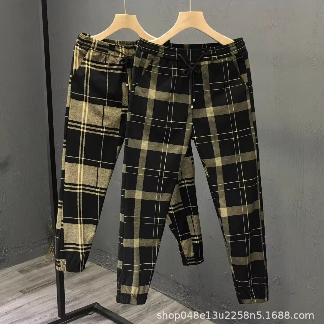 トレンディなブランドファッションチェック柄9点パンツメンズ夏薄いトレンディな小脚パンツ韓国スタイルスリムフィットレギンスカジュアルパンツ