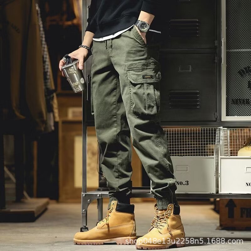 アメリカンスタイルのオートバイオーバーオールメンズ春と秋のトレンディなブランドスリムフィットレギンスメンズレトロマルチポケットカジュアルパンツ
