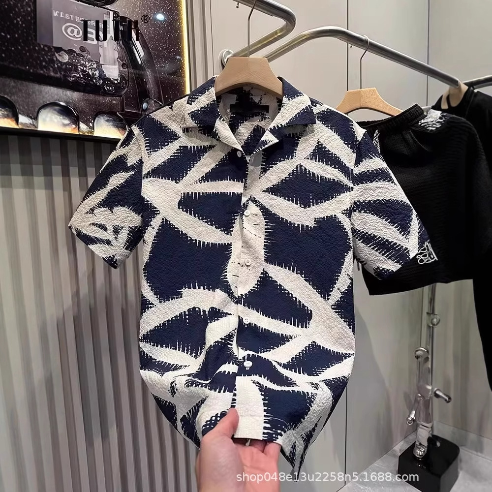 ハワイアンスタイル半袖シャツメンズ夏のトレンディなブランドスリムフィットシアサッカーキューバンカラープリントカジュアル半袖シャツ