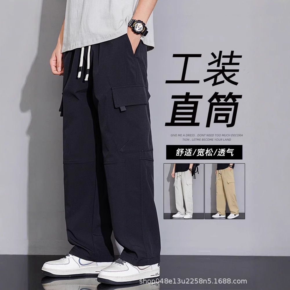 オフホワイトのアイスシルクオーバーオールパンツ男の子夏ストレートルーズパンツティーンエイジャーアメリカン春と秋カジュアルメンズパンツ