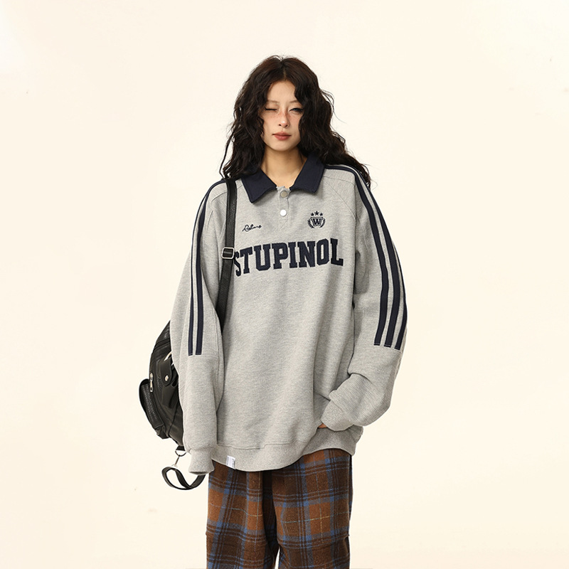 春の新作アメリカンレトロポロカラースウェットシャツレディース春オールマッチルーズトレンドカップルトップ