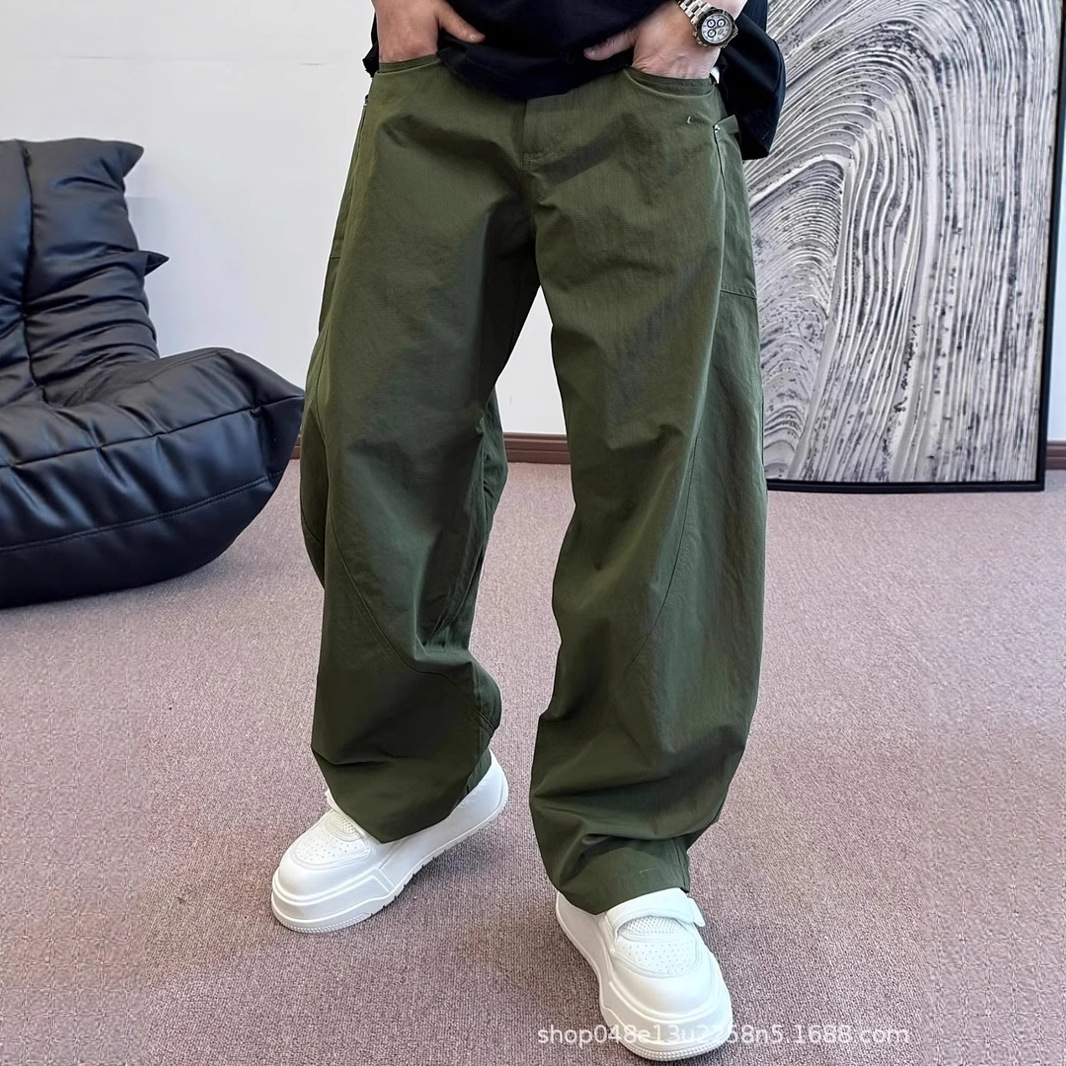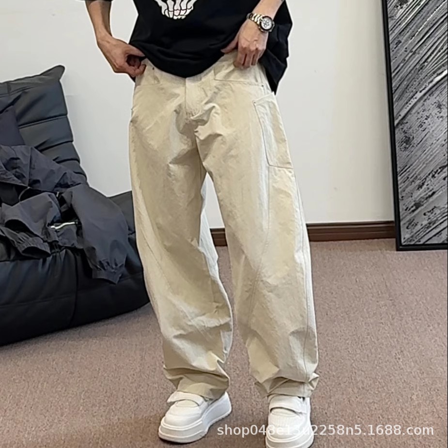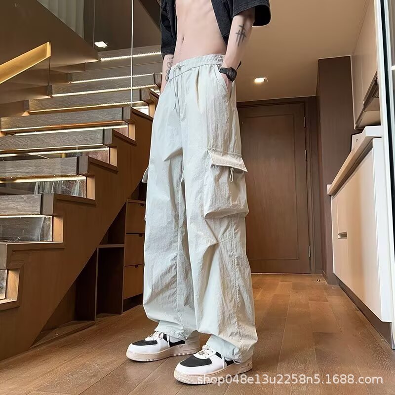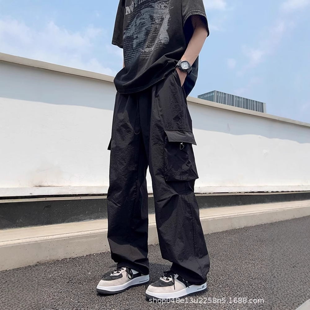 夏の新作メンズシミターパンツ、大きなポケット、薄手、シンプルなワイドレッグパンツ、ファッショナブルなワークウェア、多用途カジュアルストレートパンツ